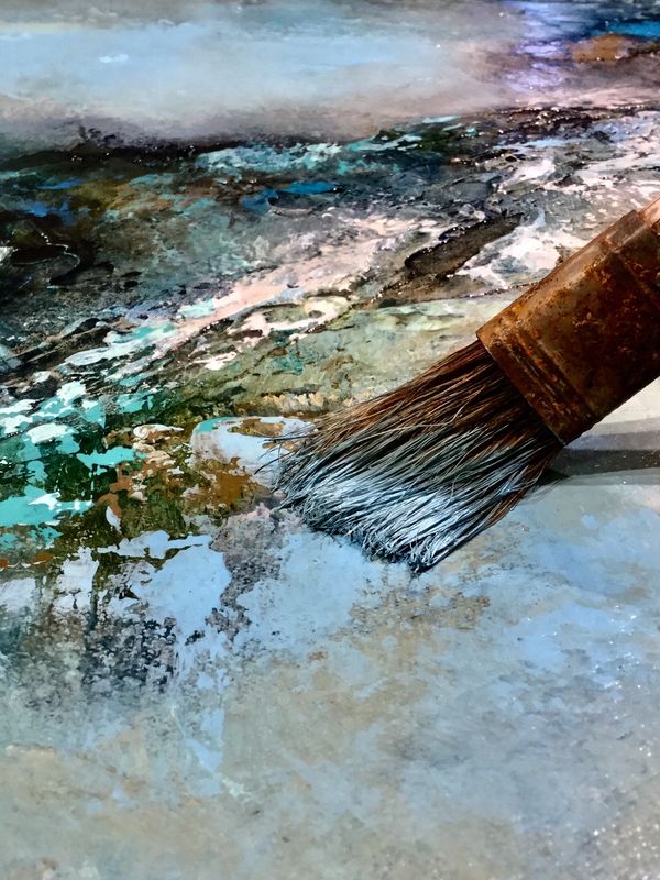 The act of painting is as much about the mind as it is about the body. Like a choreography in which gestures and thoughts parade, follow one another, intersect, the moving material is transformed until the sublime revelation of the moment when there is nothing more to add. From this long and slow quest for the absolute, the very transformation of the work remains perceptible from its genesis to its completion. Thus, in its development, the forms are superimposed in successive layers of acrylic paint and aerosol latex, using stencils of natural or manufactured plants. New layers of paint, this time of glazes and impastos give a quality of depth to the painting. The final image often originates from the background of the painting from which it emerges. The repertoire of symbols, shape, color and material are evocative of the primary subject. They are inspired as much by a particular place as by a period in time and they animate the surface according to an almost dreamlike disorder, without preconceived ideas, favoring an automatic approach to creativity. My approach is essentially intuitive and meditative. Painting is for me a territory of pure and limitless expression, both for the creator and for the viewer. The origin of the images arises from the swamps of the painter's unconscious and develops in the viewer's gaze into as many intimate landscapes as he himself can invent. By creating atmospheric spaces, I hope to reach the hidden aspect of things as well as the interiority of the spectators who hide under external appearances.